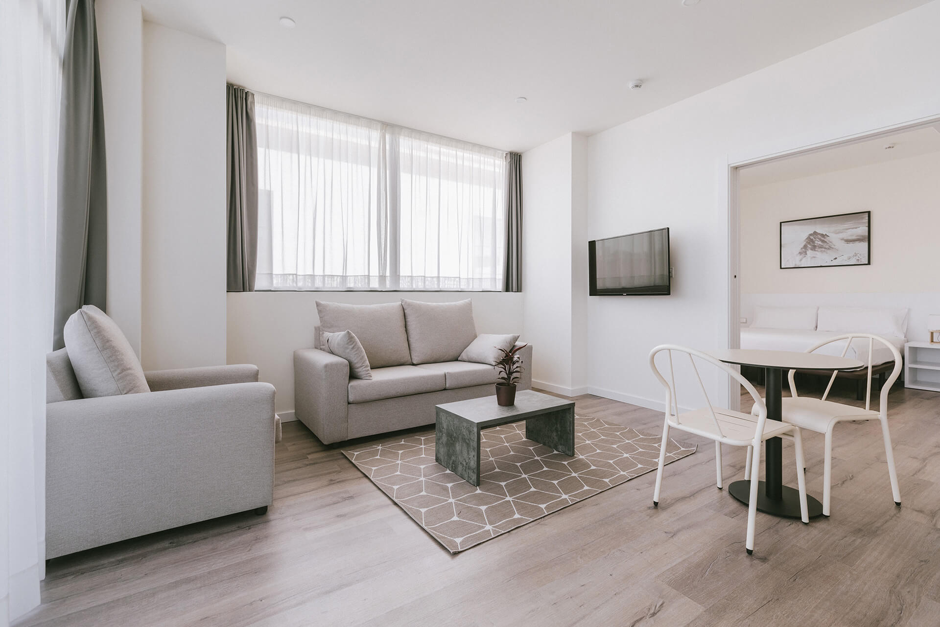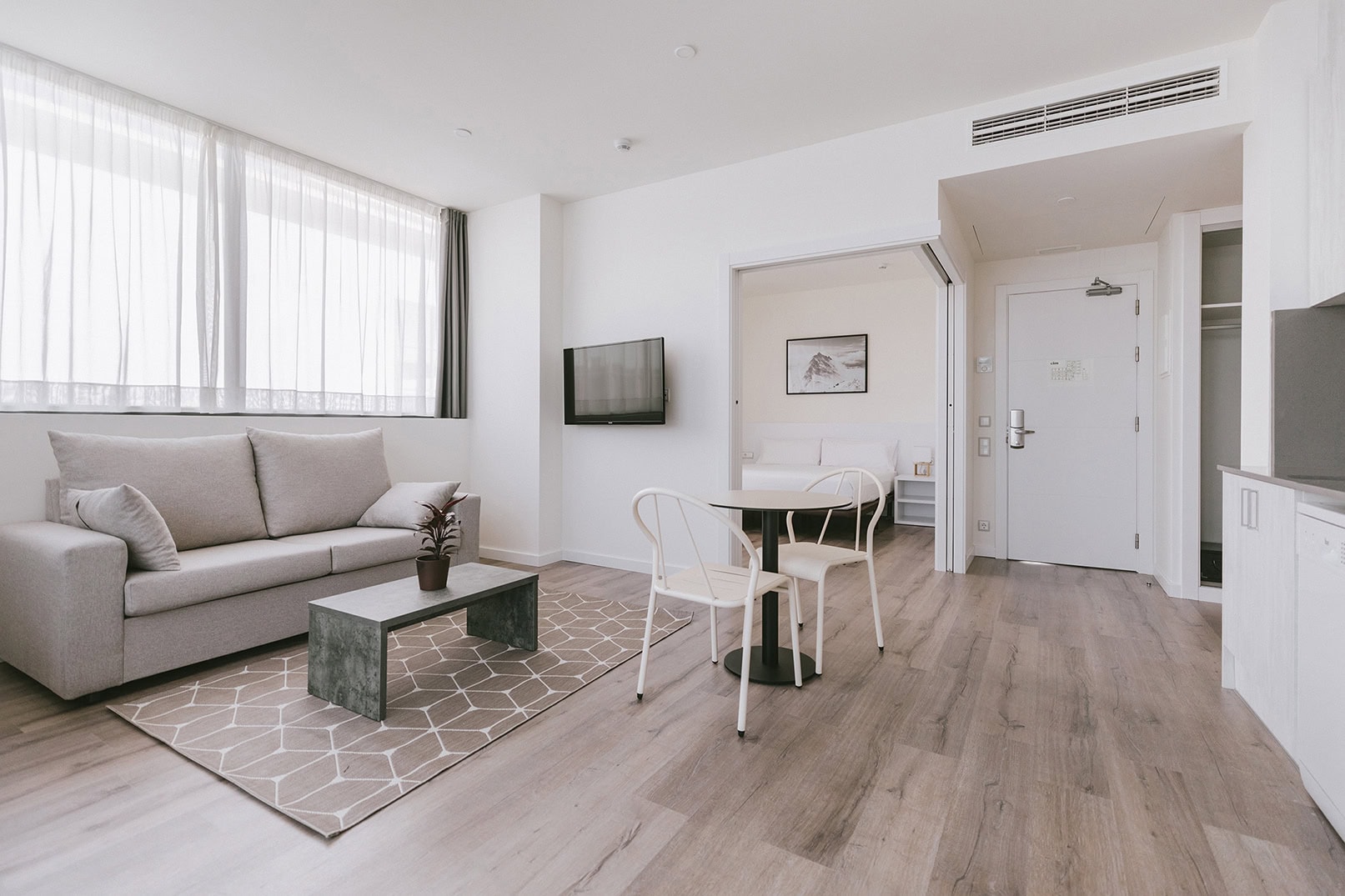 Very spacious rooms with two very distinct areas, equipped with a bedroom with double bed, living room with a 43 inch TV set, sofa and desk, fully-fitted bathroom with bathtub, fully-equipped kitchen and separate terrace with table and chairs.