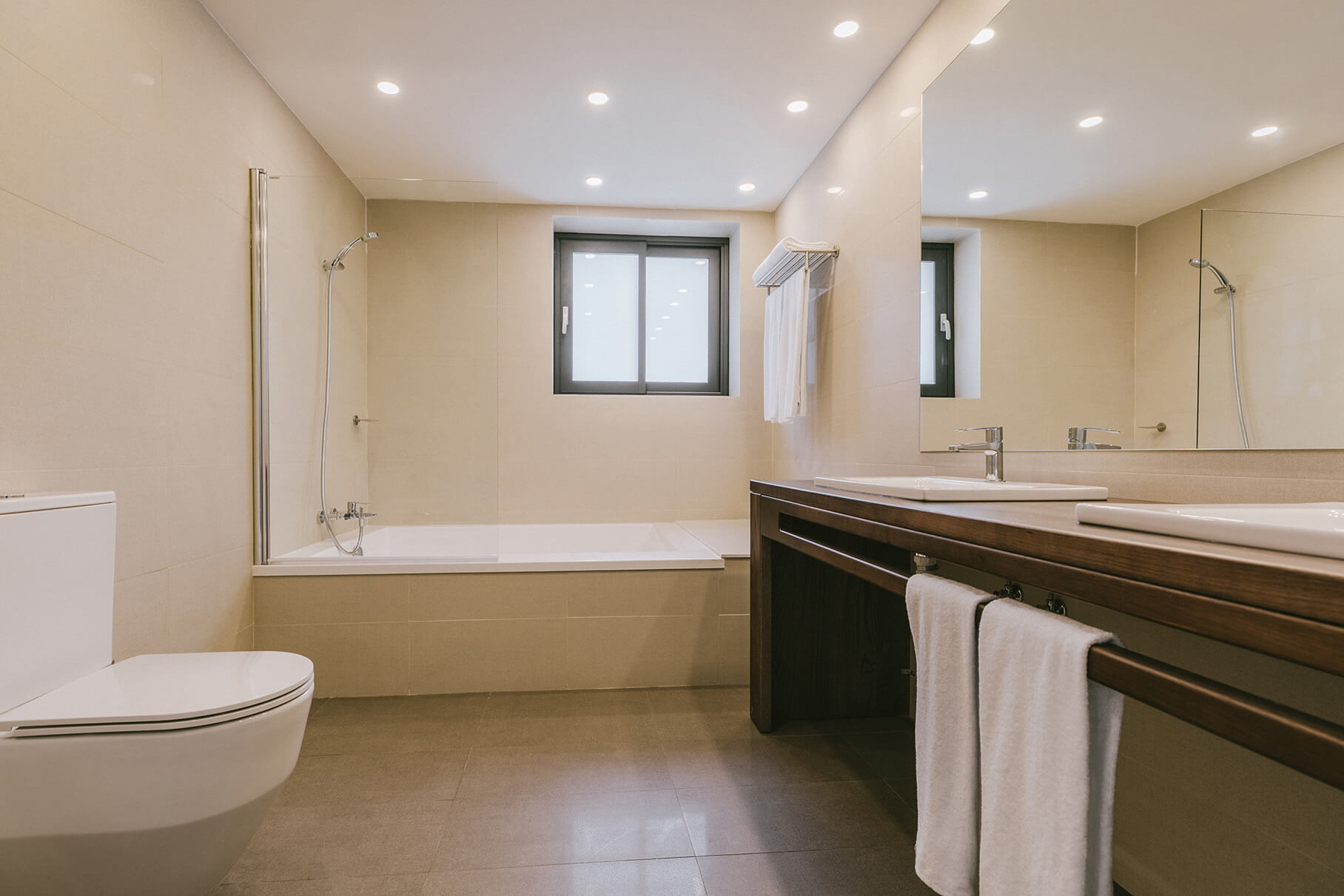 The apartment hotel offers spacious, fully-equipped superior rooms. A bedroom with double wardrobe, a very comfortable double bed (can be separated) and a fully-fitted bathroom with an XXL size bathtub and hair dryer.